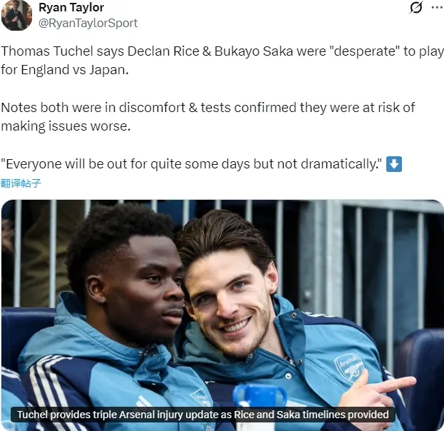 另外图赫尔的表态是“没必要拿两人冒险”,也就是说踢比赛是可以踢的,没必要冒险,因此其实萨卡和赖斯没啥问题,不用担心。