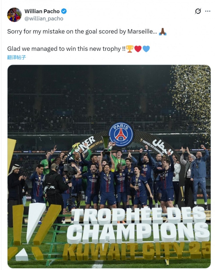 帕乔社媒晒出捧杯照片,并写道:“很抱歉我的失误导致马赛进球,很高兴我们最终赢得了这座新奖杯!”